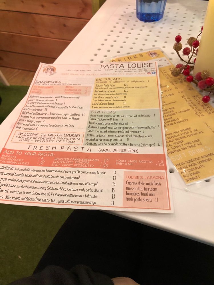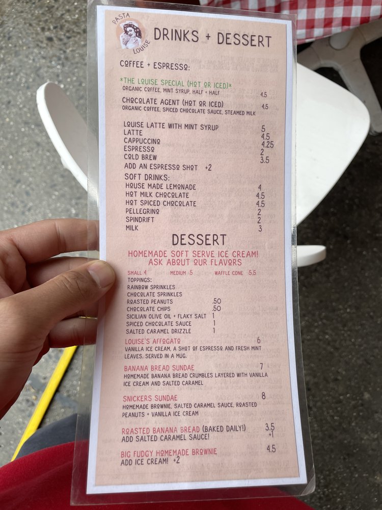 Pasta Louise Cafe, located in Brooklyn, NY, offers a delightful Italian and sandwich menu. The cafe provides a variety of options such as avocado egg toast, banana bread, brownies, cookies, bread plates, burrata with Sicilian olive oil, citrus olives, and crispy chickpeas. Customers rave about the delicious pasta, soft serve, and banana bread, with a rotating selection of flavors. The cozy atmosphere and friendly service make it a charming spot for a meal. Despite some reviews mentioning slow service, the overall experience seems to be positive, with many returning for the pasta salad, soft serve, and banana bread. With convenient utilities like delivery, takeout, and wheelchair accessibility, Pasta Louise Cafe caters to a diverse range of customers looking for a tasty and satisfying meal experience.